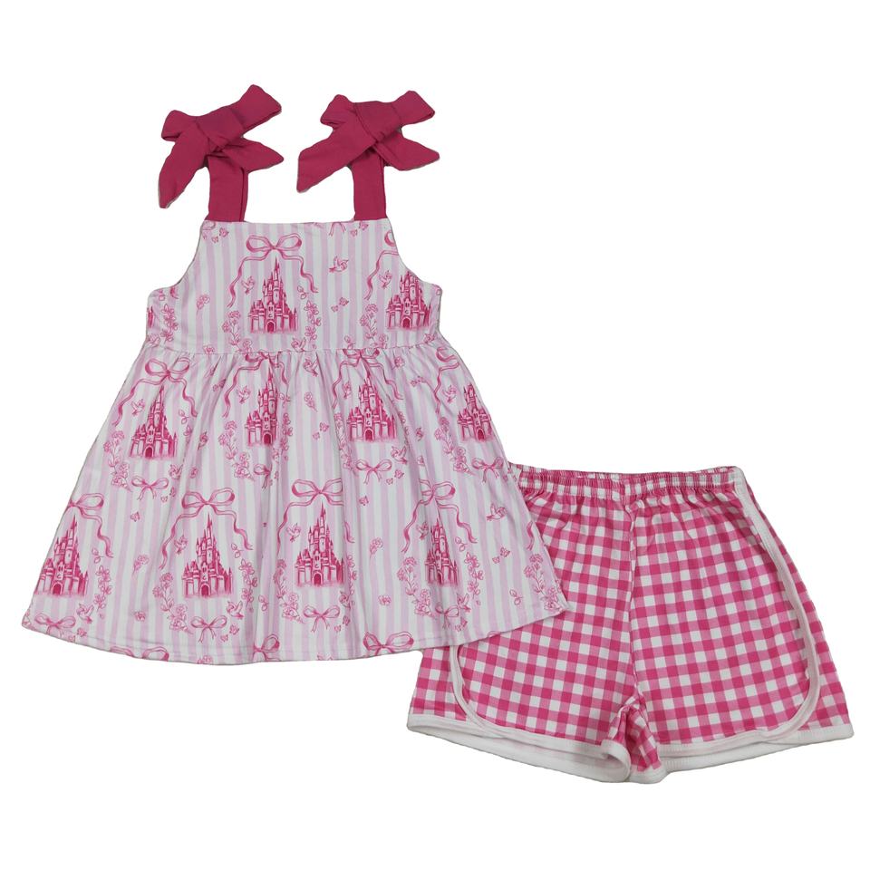 Wholesale Little Girl Boutique Pink Castle Print Summer Outfits Casual Country Style Toddler Girl Short Sleeve Clothing Set
