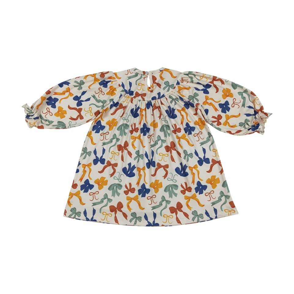 Wholesale Long Sleeve Toddler Girls Dress Smocked Embroidery Thankful Bows Fashionable Day Outfit Baby Girls Clothes Boutique