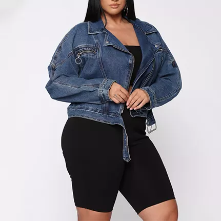 Wholesale Loose Long Sleeve Zipper Down Belt Lock Short Jean Cropped Plus Size Women's Denim Jacket