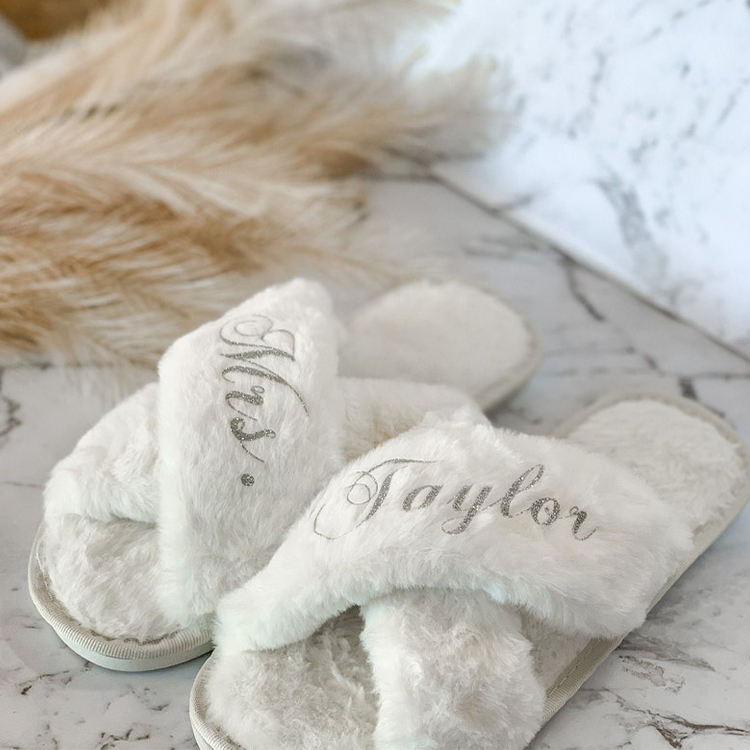 Wholesale Luxury Cross Fur Slipper Women Custom Silver Logo Gold Silver Stamping Embroidered Custom Bridesmaid Winter EVA