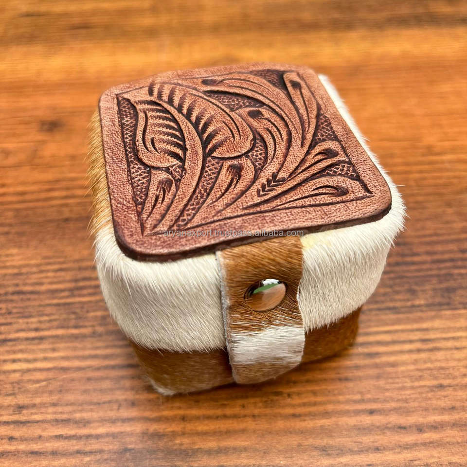 Wholesale Luxury Design Hand Tooled Leather Engagement Ring Holder Cowhide Wedding Ring Bearer Box Personalized Jewelry Display