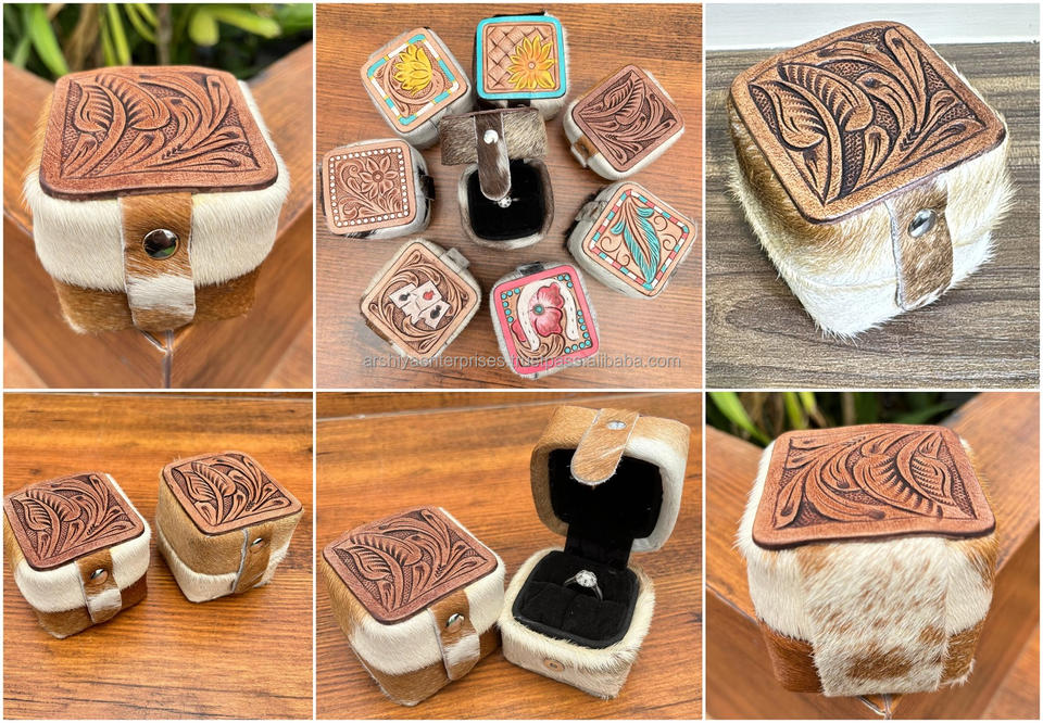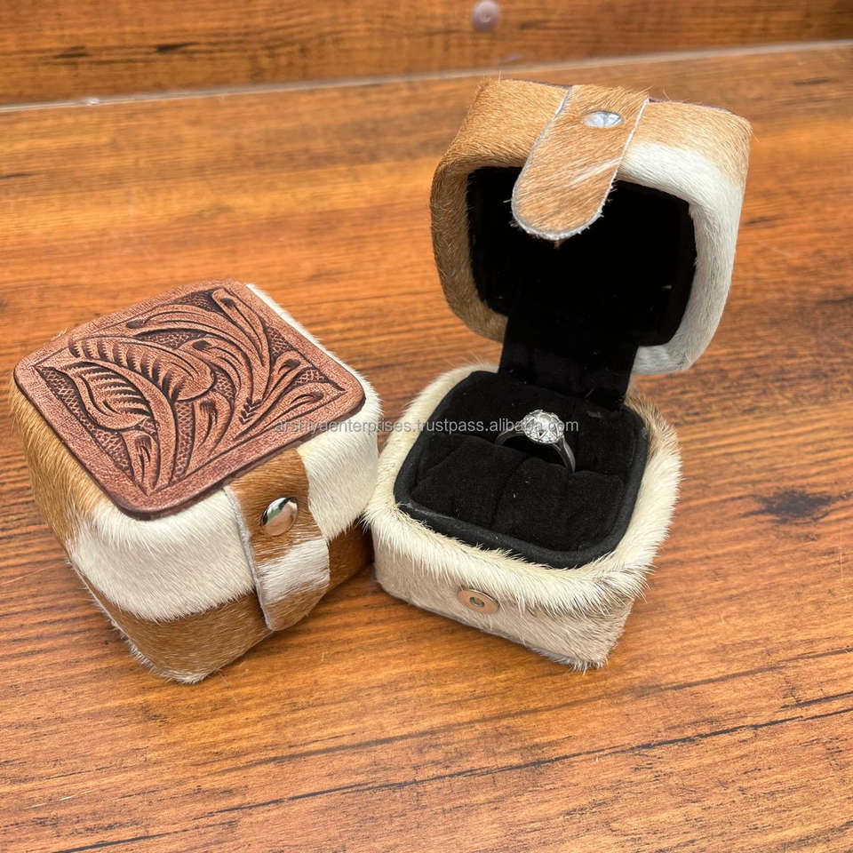 Wholesale Luxury Design Hand Tooled Leather Engagement Ring Holder Cowhide Wedding Ring Bearer Box Personalized Jewelry Display