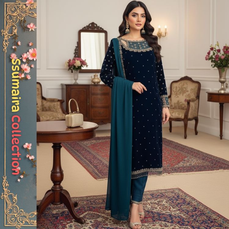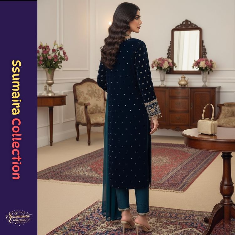 2025 Wholesale Luxury Navy Blue Velvet Embroidered Dress with Keyhole Neckline - Pakistani Party & Wedding Outfit Anarkali