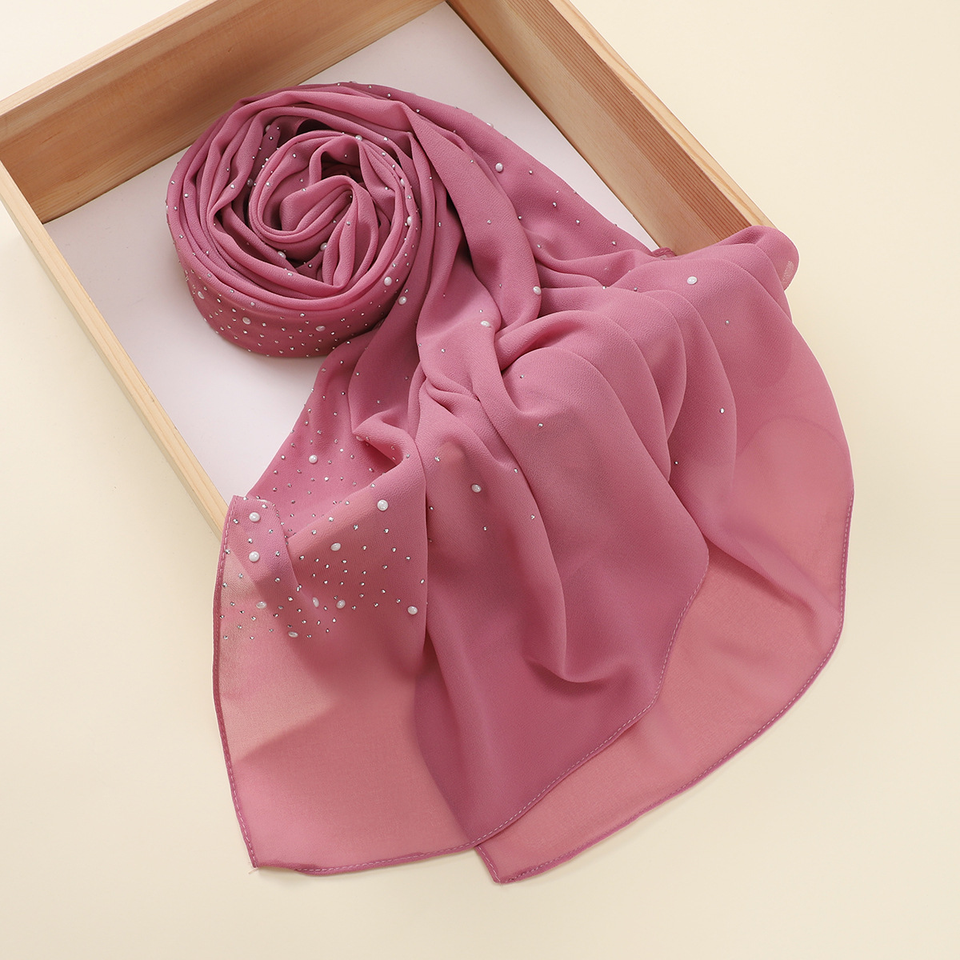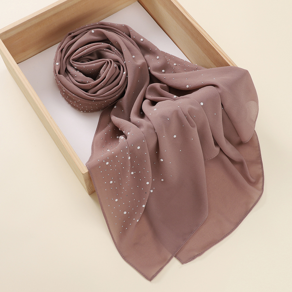 Elegant 100% Polyester Pearl Chiffon Hijab Scarves Wholesale Malaysia Hot Drill Foulard Head Wraps Swaddles Plain Solid Colors