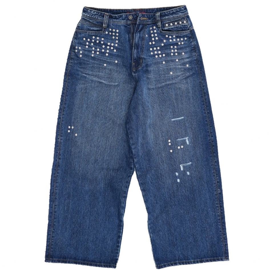 Wholesale Men Vintage Blue Baggy Diamond Jeans Distressed Studded Heavy Weight Slub Denim Jeans