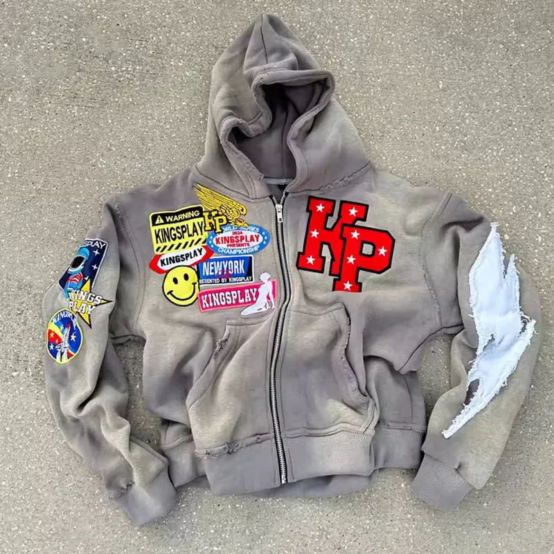 Wholesale Men's Cropped Hoodie Distressed Embroidery Print Fall Acid Wash Vintage Sun Faded Zip Customized French Fleece Fabric