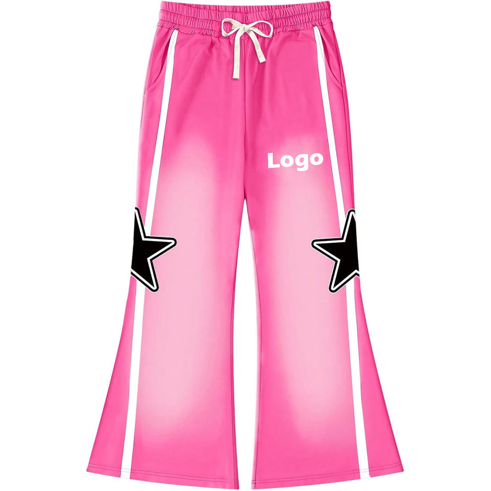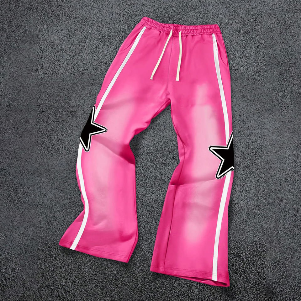 Wholesale Men's High Quality Custom Printed White Side Stripes And Bold Black Star Patches Pink Flared Sweatpants