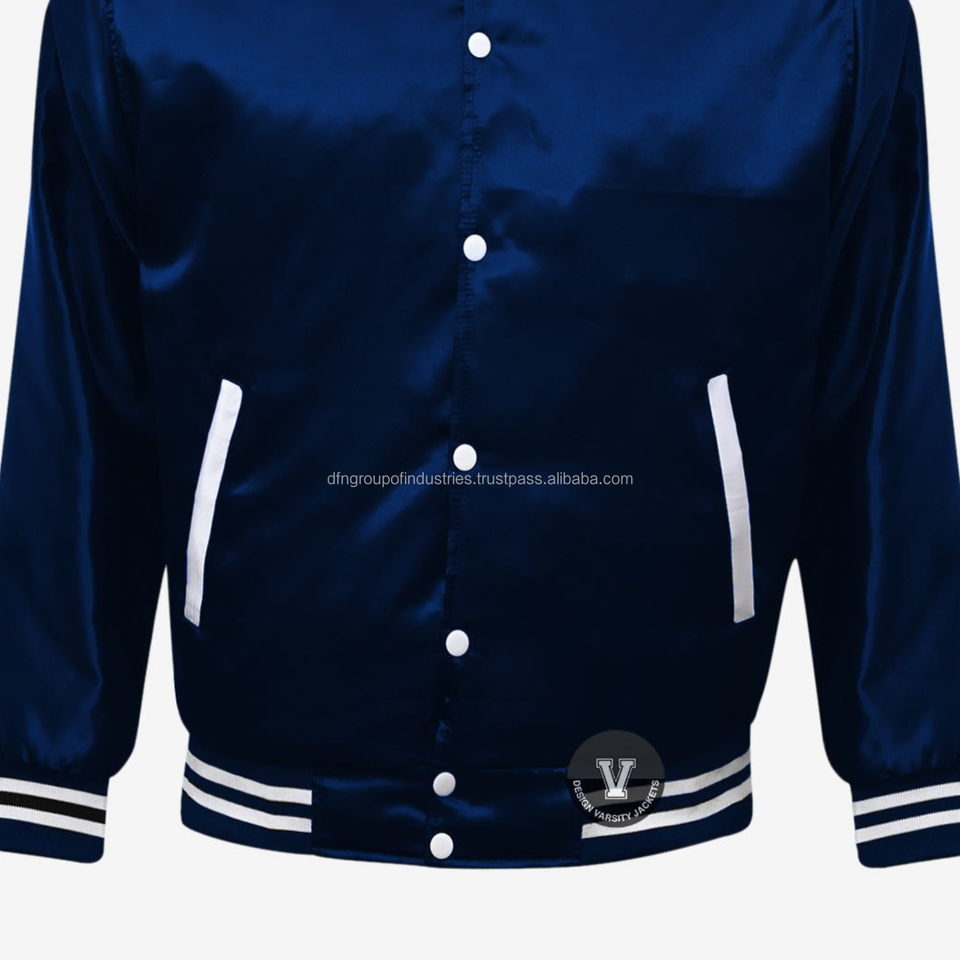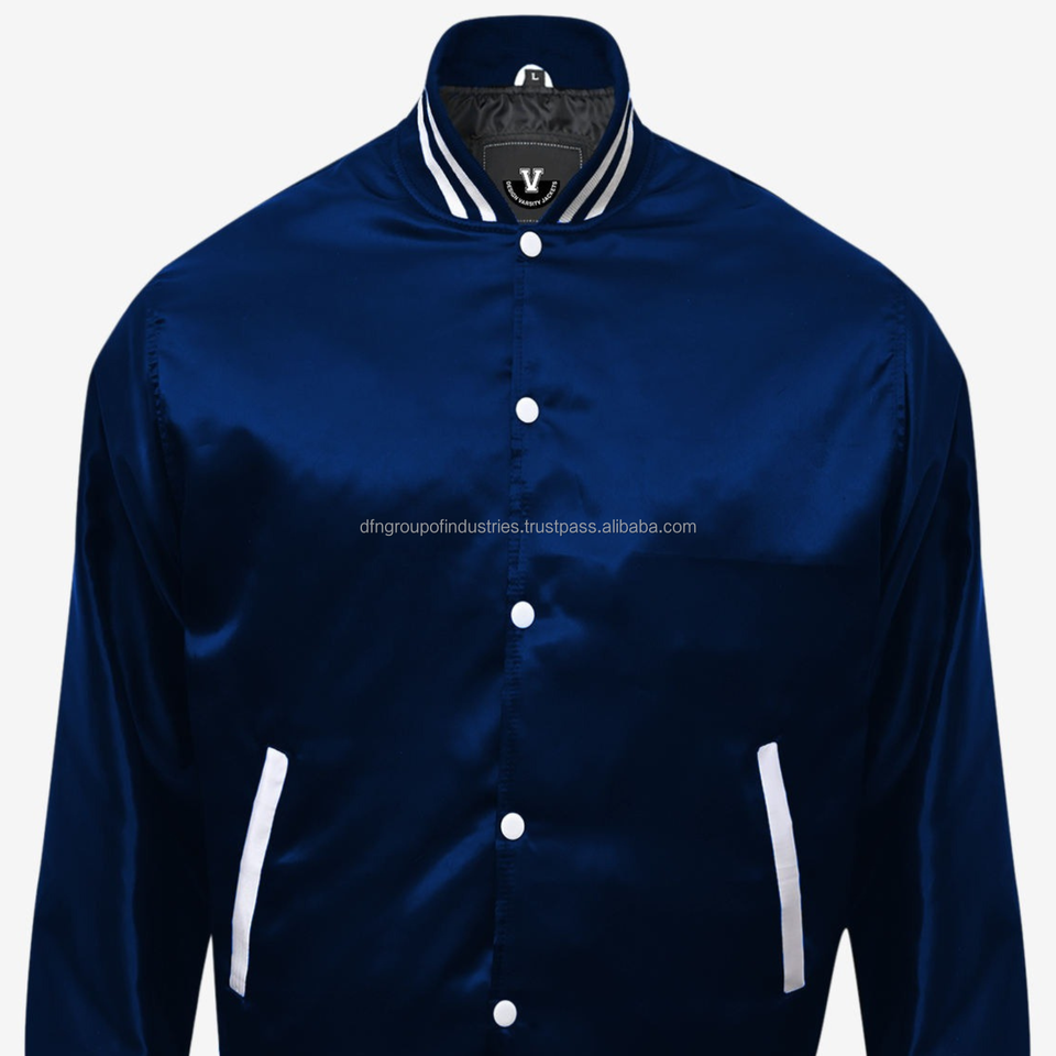 Wholesale Men's Red Satin Varsity Baseball Jacket Cool Style Knit Collar Windbreaker with Striped Trim Denim Fabric Coated