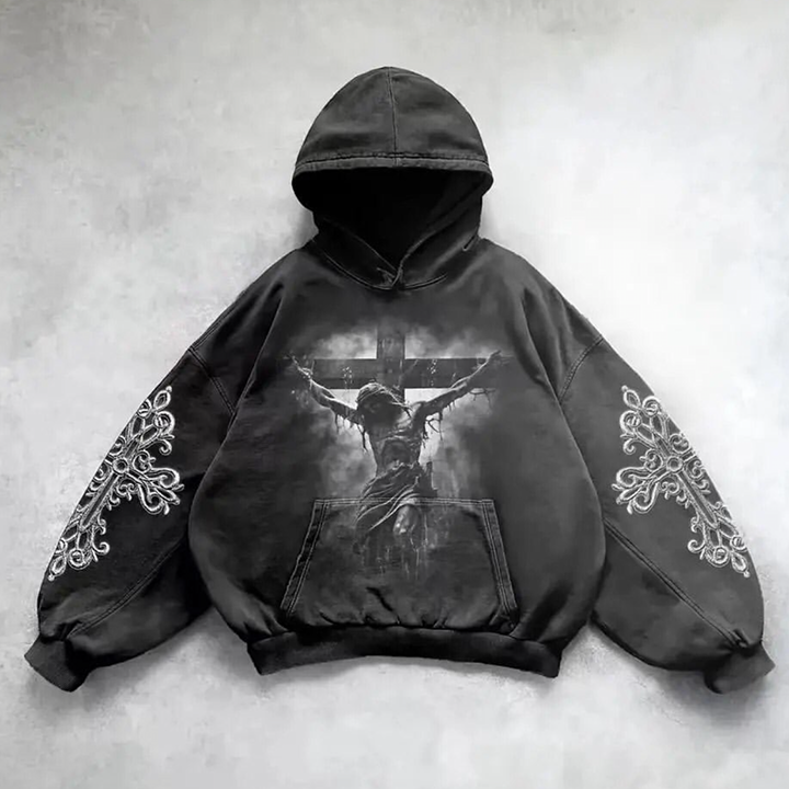 Wholesale Mens Vintage Acid Wash Distressed Hoodies 500 Gsm Black Color Printed Design Pullover Hooded Cotton Hoodie