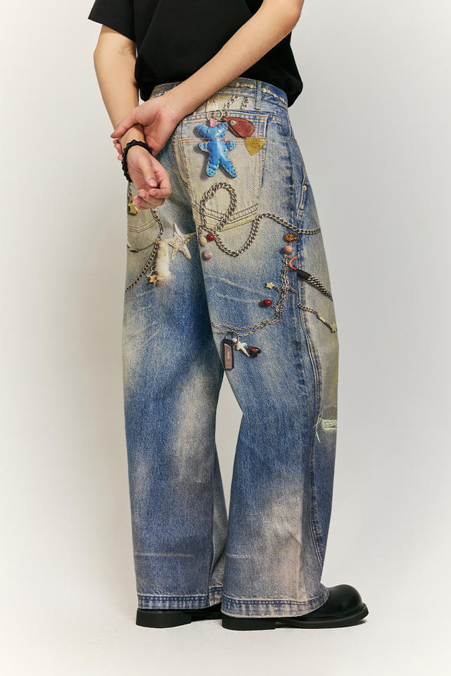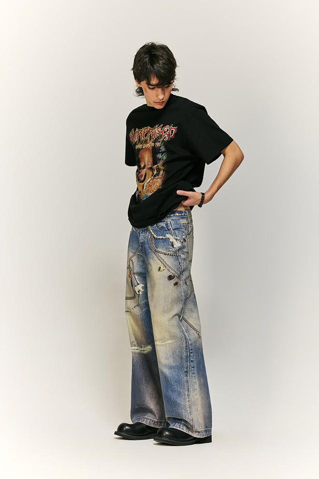 Wholesale Mid Waist Men's Straight Leg Jeans 100% Cotton Custom Digital Print Bear Pants High Street Style New Slacks