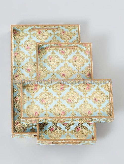 Wholesale Modern Floral Diwali Enamel Printed Touch Sensing Decorative Storage Serving Tray Resin and Wood Material