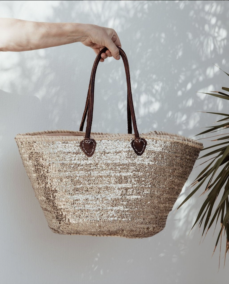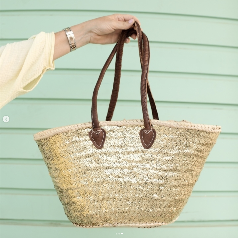 Wholesale Moroccan Palm Leaf Basket Bag Gold Sequins Handwoven Bohemian Fashion Lady Beach Shopping Bag