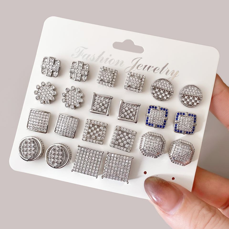 Wholesale Multiple Full Pave Gems Studs 18K Gold Plated Cubic Zircon Square Earrings for Women Daily