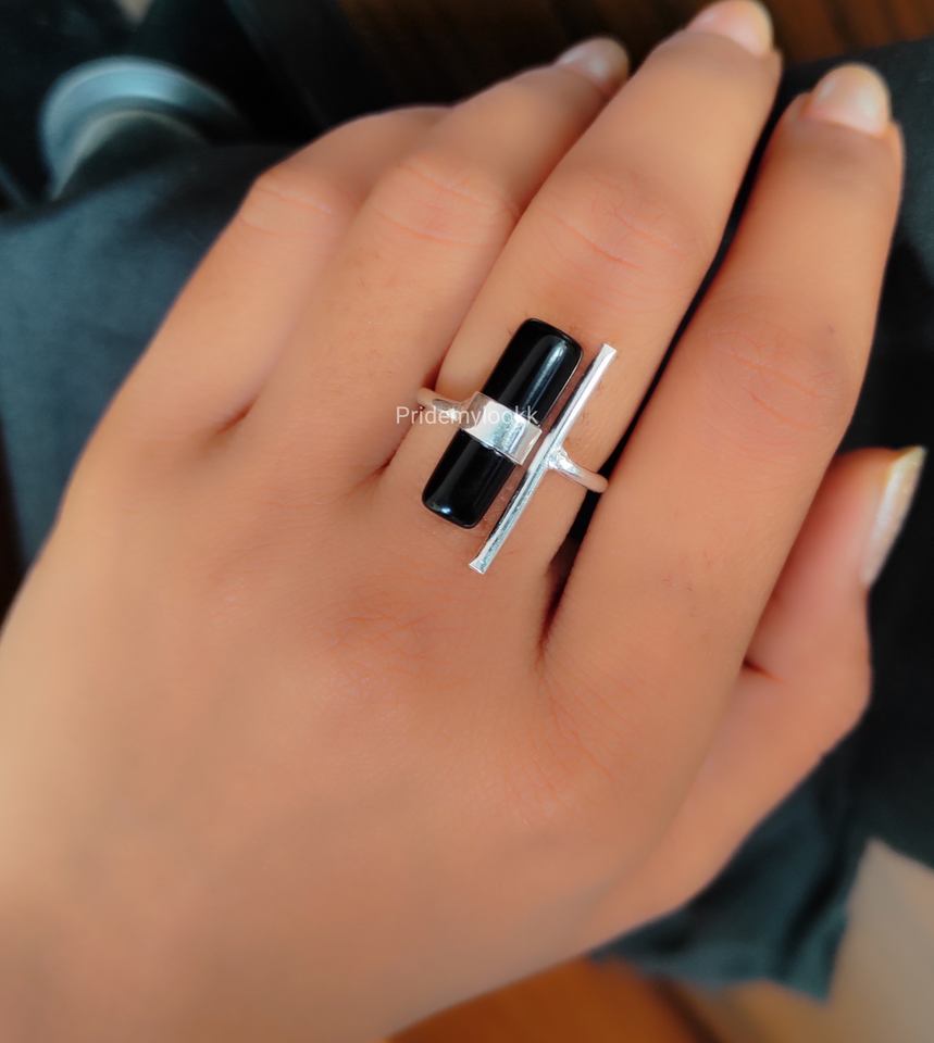 Wholesale Natural Black Onyx Bar Ring for Women Long Silver Plated Statement Ring for Wedding or Christmas Sale Offer