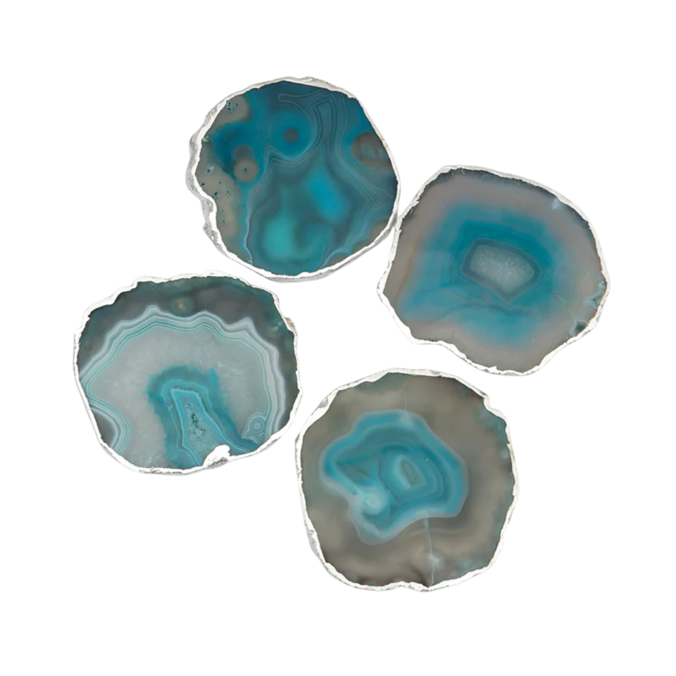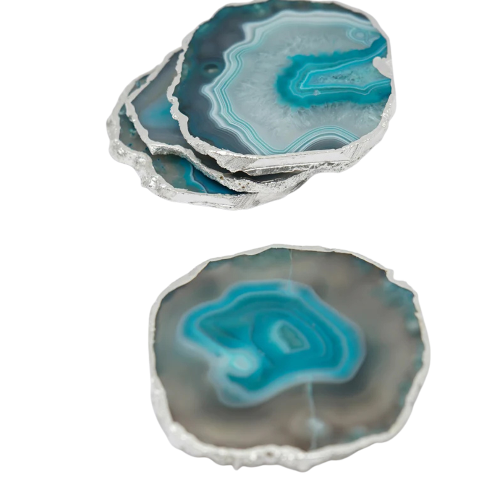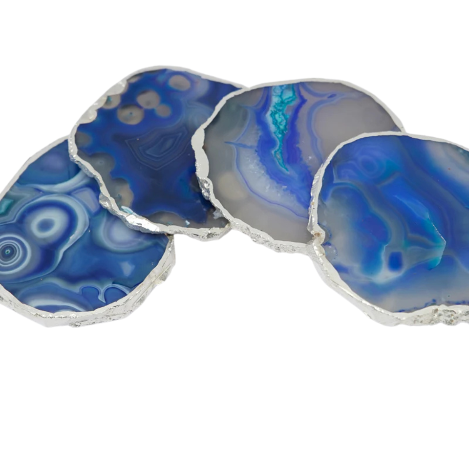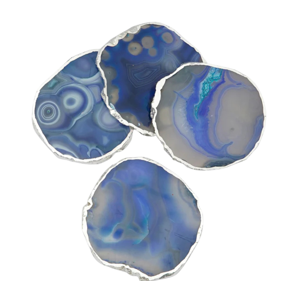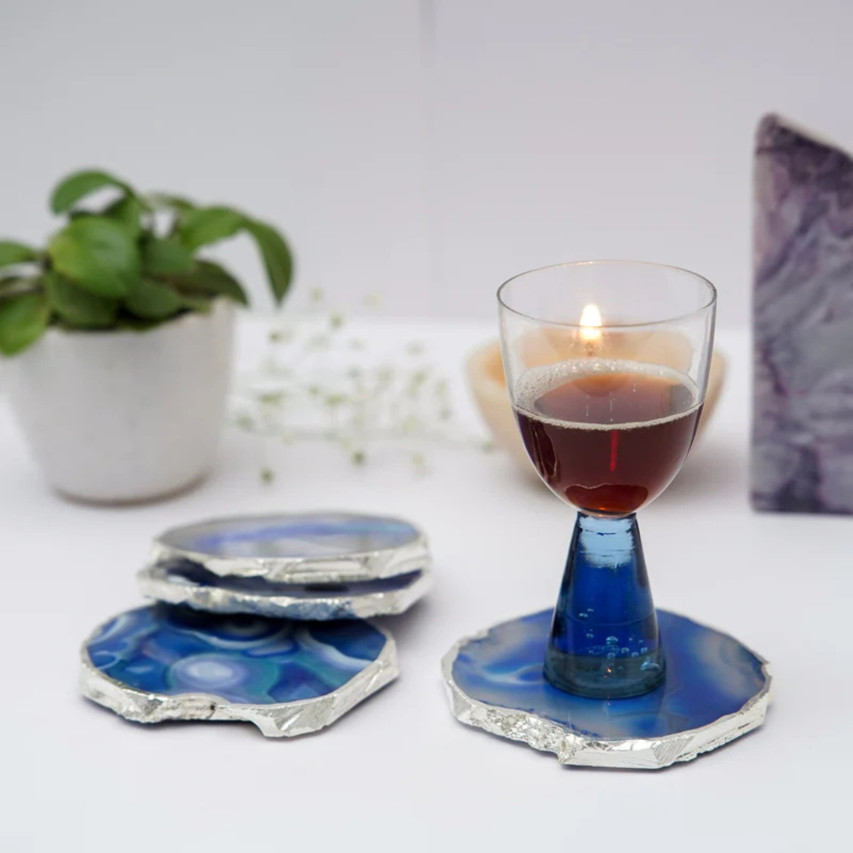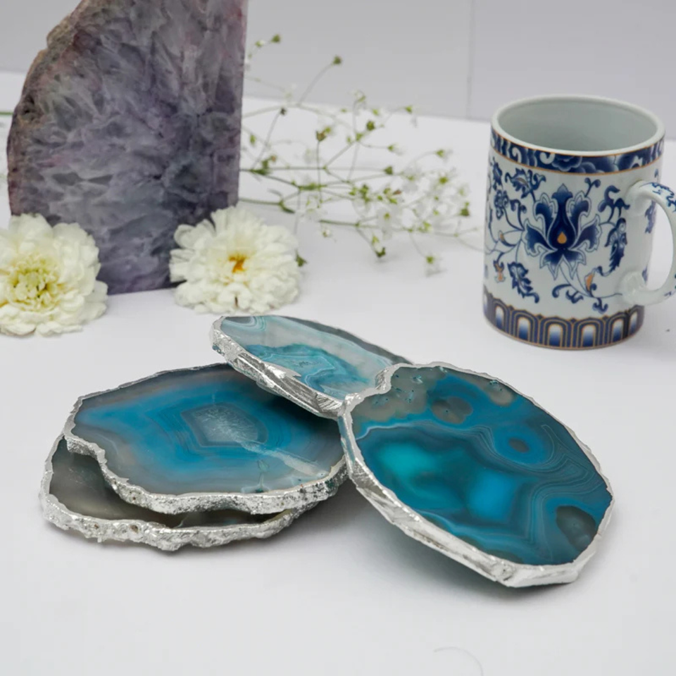 Wholesale Natural Blue Agate Drink Coasters with Silver Edge Bulk Semi-Precious Stone Crafts Coaster