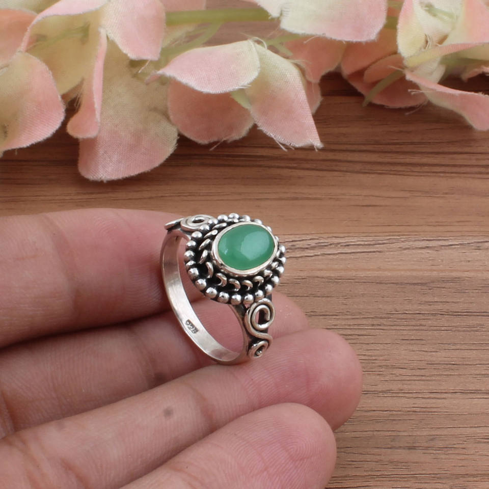 Wholesale Natural Green Turquoise Sterling Silver Dotted Milgrain Bezel Setting Artisan Classic Ring for Women
