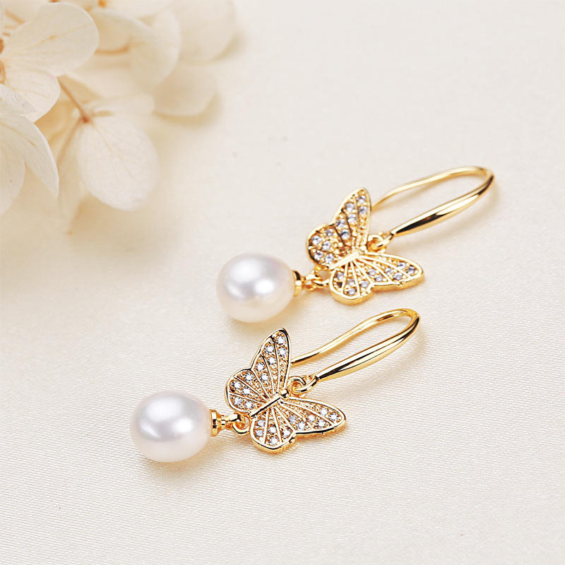 Wholesale New Butterfly Style Freshwater Pearl Earrings for Women Zircon Plated Gold Dangle Fashion Jewelry