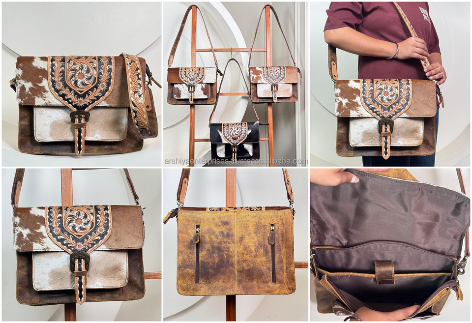 Wholesale New Design High-end Women Hand Tooled Leather Crossbody Shoulder Laptop Purse Custom Genuine Cowhide Messenger Bags