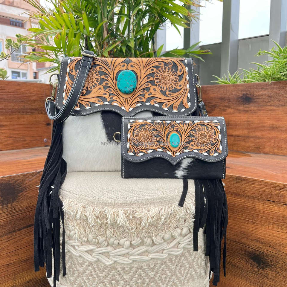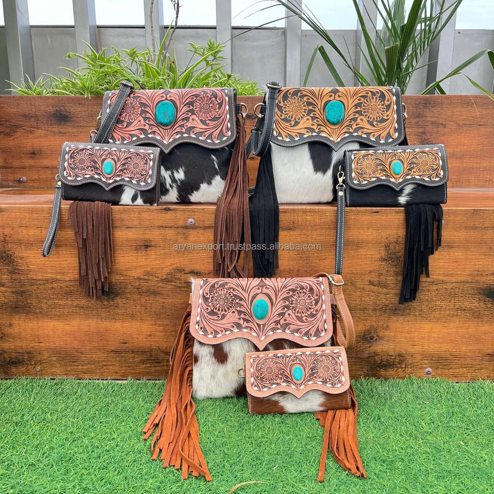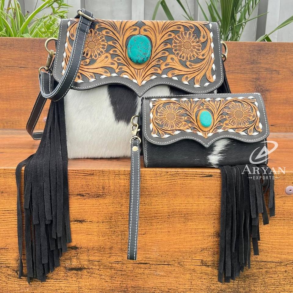 Wholesale New Vintage Hand Tooled Cowhide Leather Handbags and Hand Tooled Cowhide Leather Clutch 2 Piece Combo Set for Women's