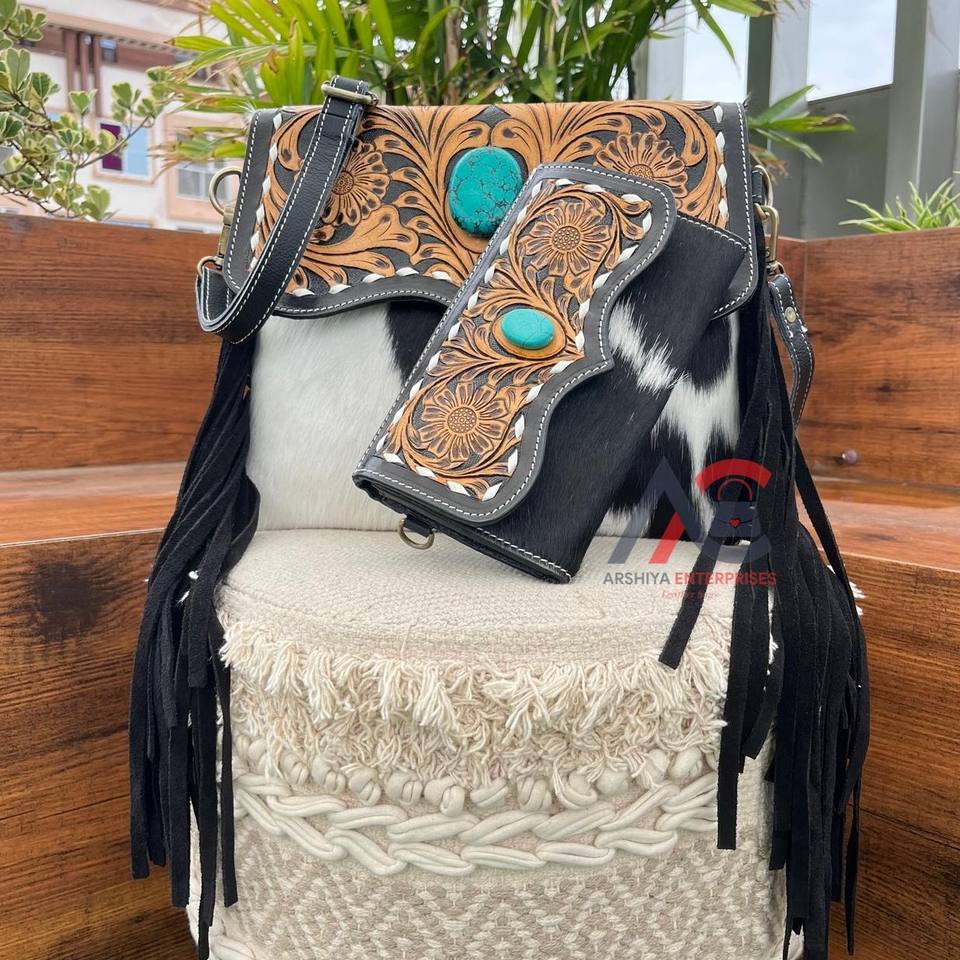 Wholesale New Vintage Hand Tooled Cowhide Leather Handbags and Hand Tooled Cowhide Leather Clutch 2 Piece Combo Set for Women's
