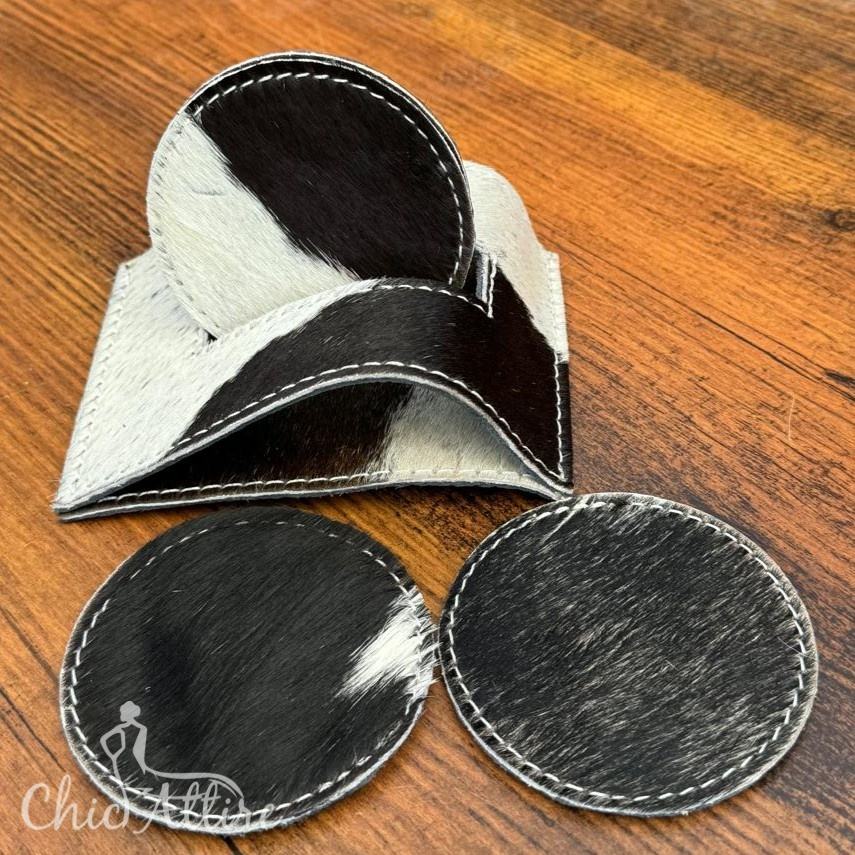 Wholesale Non-slip Genuine Leather Round Kitchen Supplies Cowhide Placemat Cup Mat Table Coaster Set with Stand for Dining Table