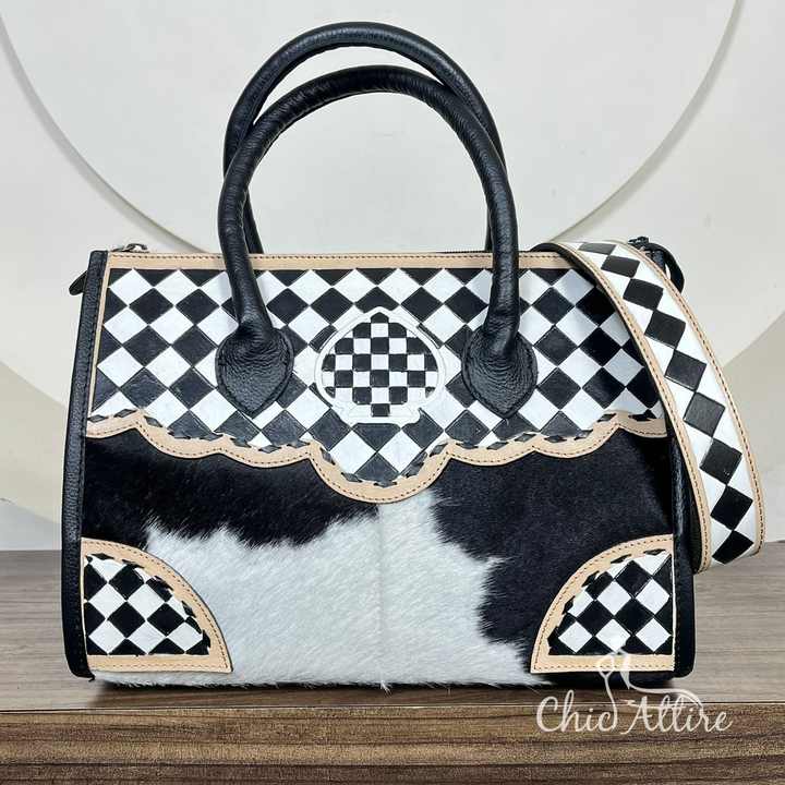 Product name:Hand Tooled Checkered Leather Crossbody Tote Bag