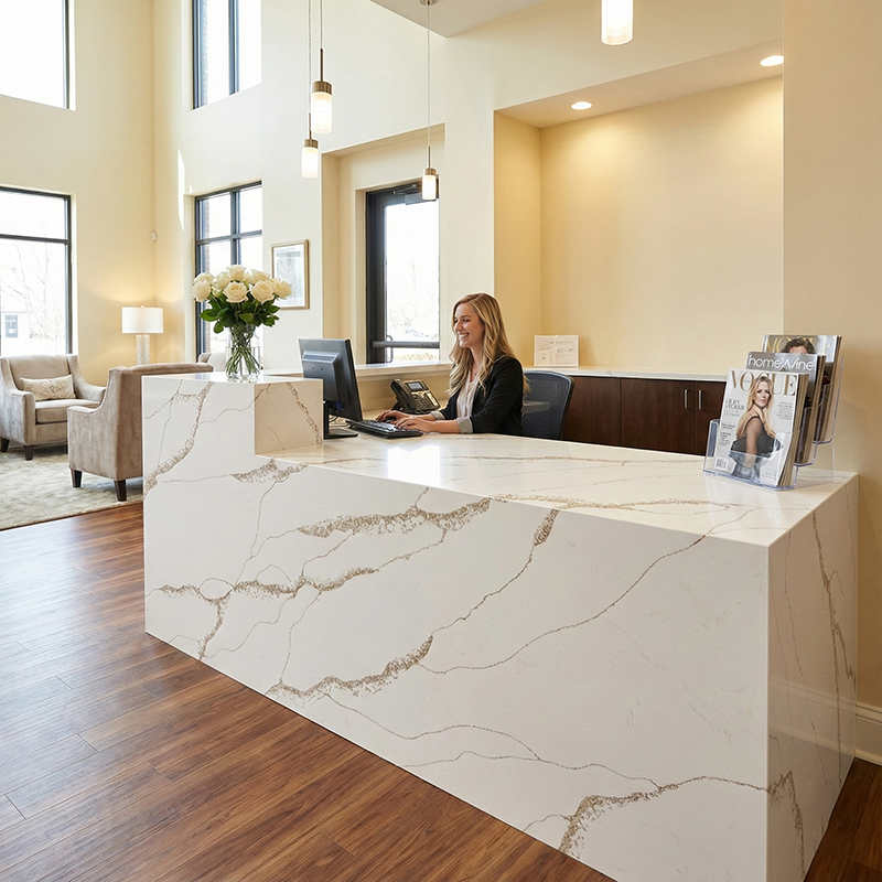 Wholesale OEM Stain Resistant Polished Calacatta Gold Quartz Stone Slab for Hotel Reception Desk Worktop