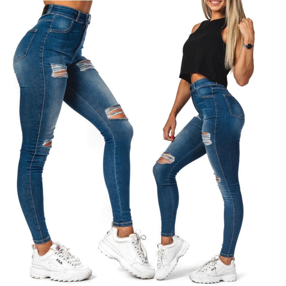 Wholesale OEM Stylish Cute Hip Hop Denim Stretchy High Waist Distressed Blue Washed Rips Skinny Women's Jeans