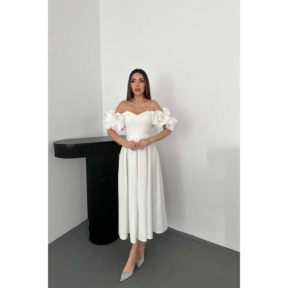 Wholesale Off-White Satin Evening Dress with Sleeves & Balloon Pleats