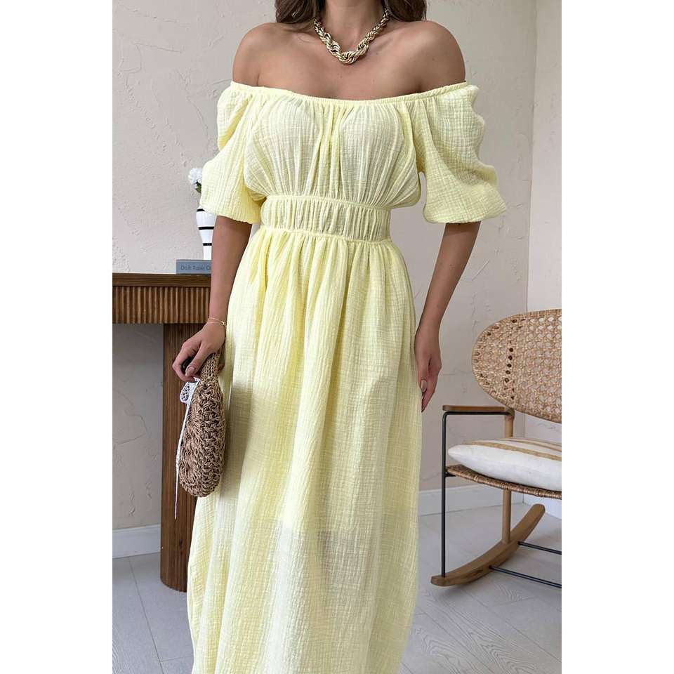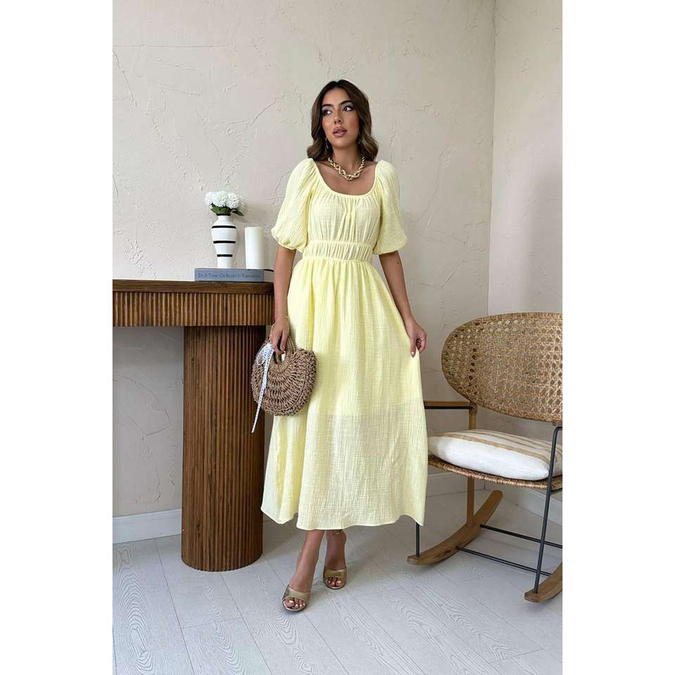 Wholesale One Size Yellow Collar Gathered Muslin Linen Dress High Quality Casual Tweed Empire Waistline Ruffles Sweet for Day