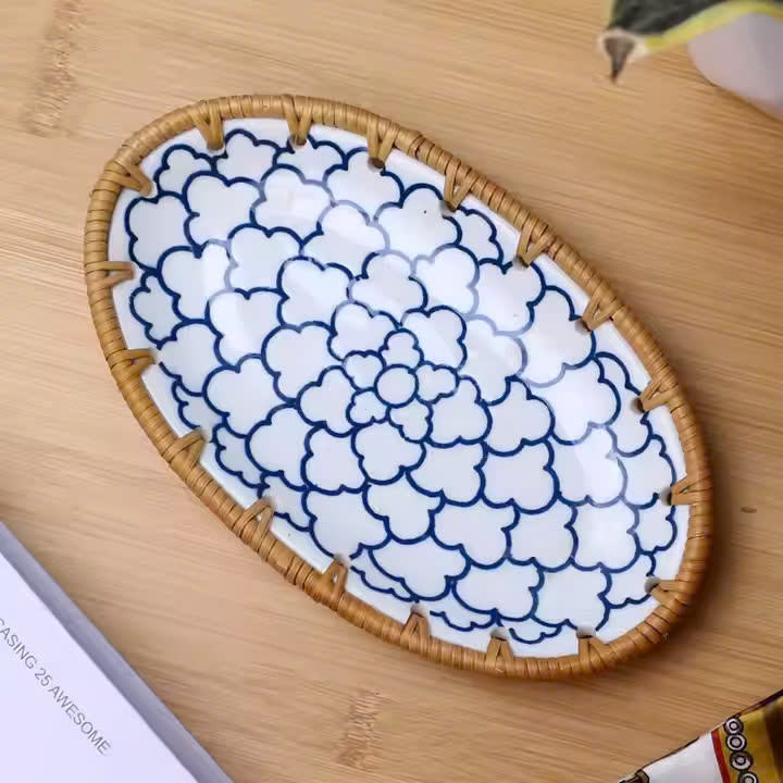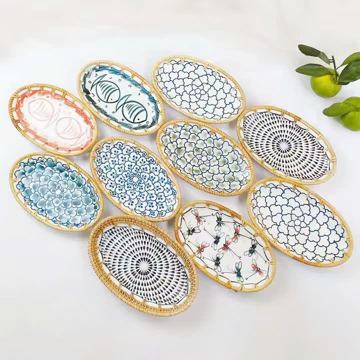 Wholesale Oval Shape Rattan Ceramics Cake Dish Plate Dessert Fruit Tray for Wedding Parties Storage Baskets