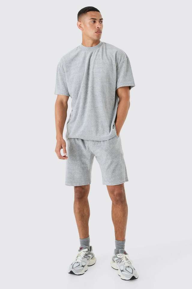 Wholesale Oversized Extended Neck Grey Marl Towelling T-shirt & Short Set Summer Men's Beach Set Baggy Style Matching Men's Set