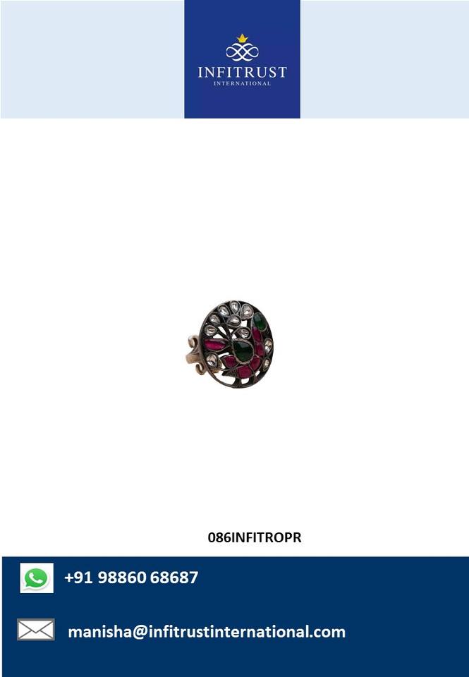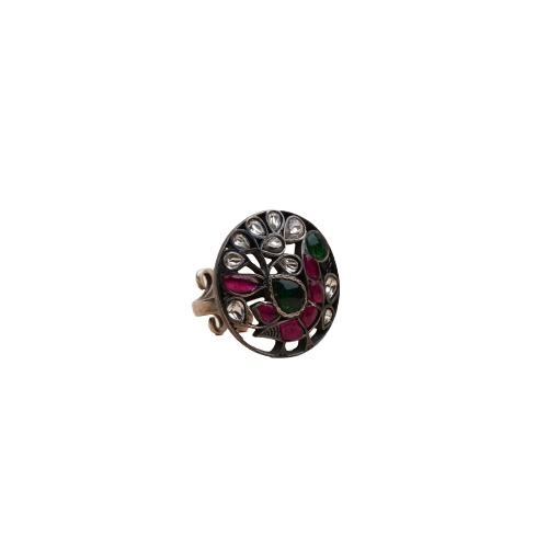 Wholesale Oxidised Silver CZ Ruby Emerald Stone Studded Rings with Mesmerising Peacock Motif for College Girls Daily Casual Wear