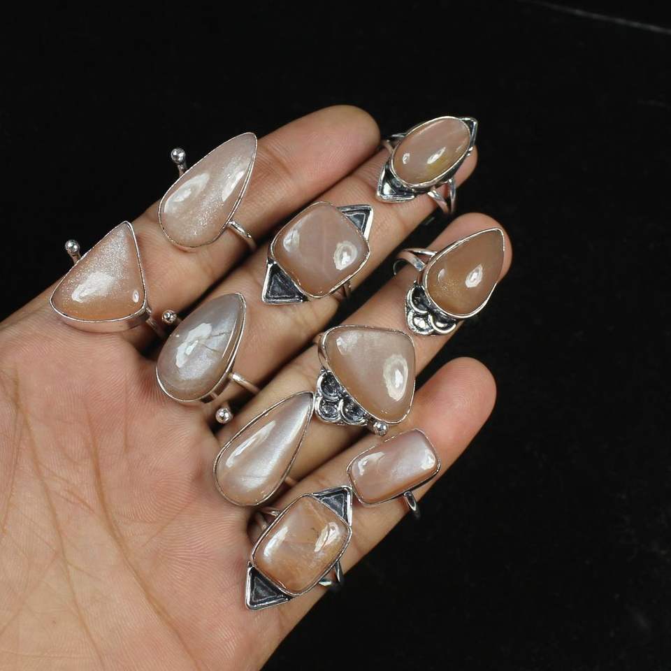 Wholesale Peach Moonstone Ring Mix Shape and Size Cabochon Ring 925 Sterling Silver Rings Lot Peach Moonstone Gemstone Jewelry