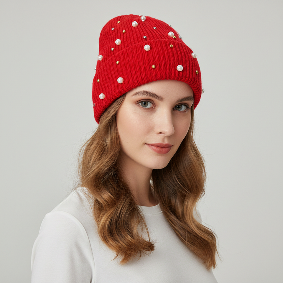 Wholesale Pearl & Stud Embellished Ribbed Knit Beanie Winter Fashion Women Warm Hat Winter Women's Fashion Knit Beanie