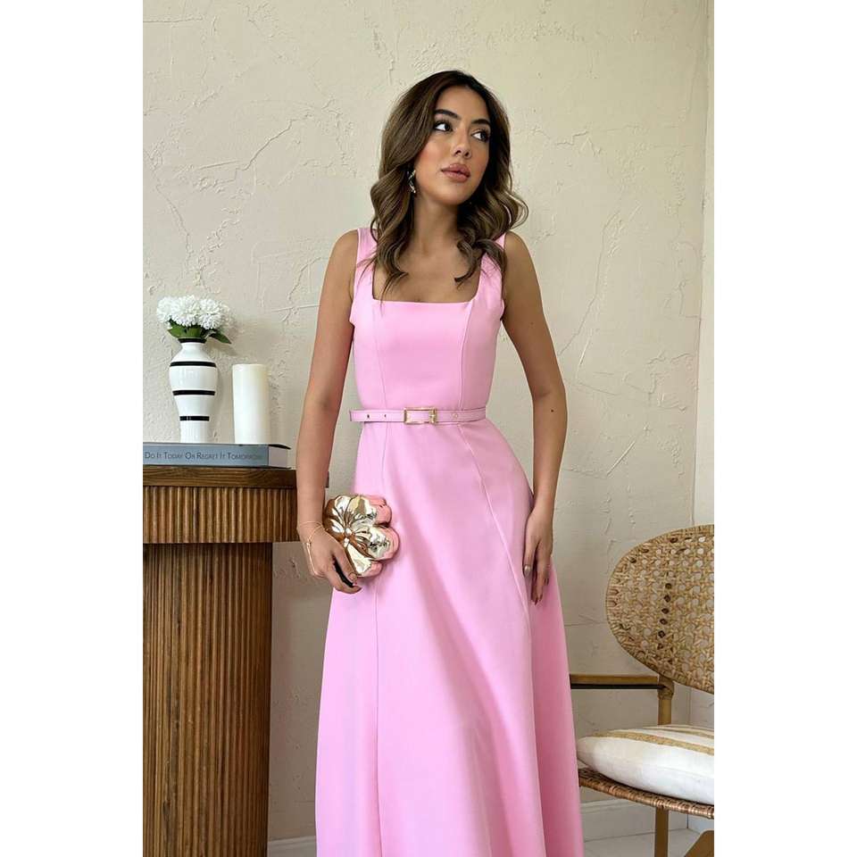 Wholesale Pink Belted Long Satin Cocktail Dress