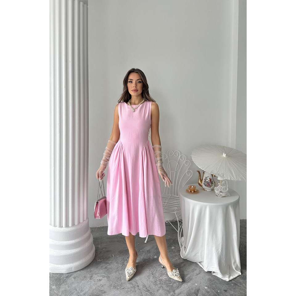 Wholesale Pink Linen Midi-Length Cocktail Dress with Gathered Sides