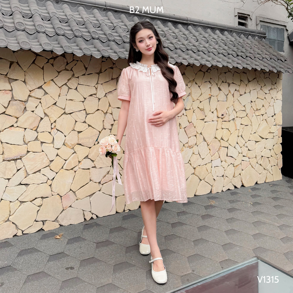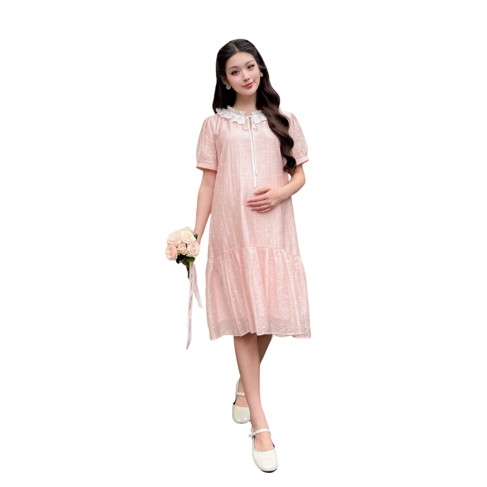 Wholesale Pink Silk Maternity Dress V1315 Floral Sweat-Absorbent Clothing Bow Print Lace Neck Detail for Pregnant Women
