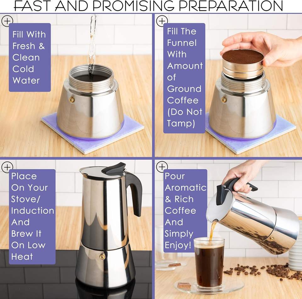 Wholesale Portable Stainless Steel Moka Pot Stove Top Coffee Maker with Lid Soft Touch Wooden Handle 6 Cups Capacity