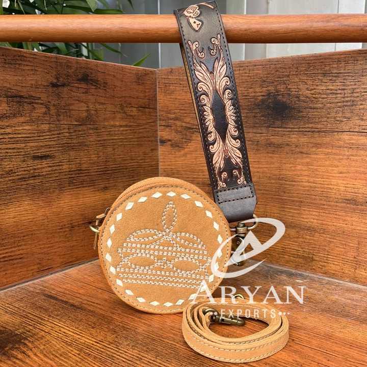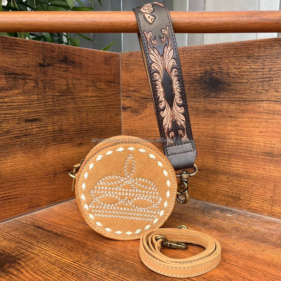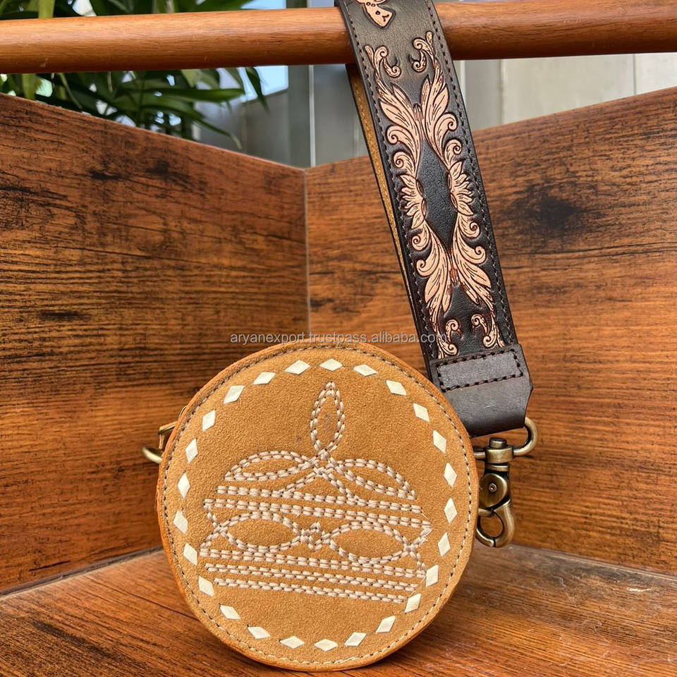 Wholesale Premium Boot Stitch Suede Leather Mini Crossbody Coin Purse Hand Tooled Wristlet Round Zipper Money Pouch for Women's