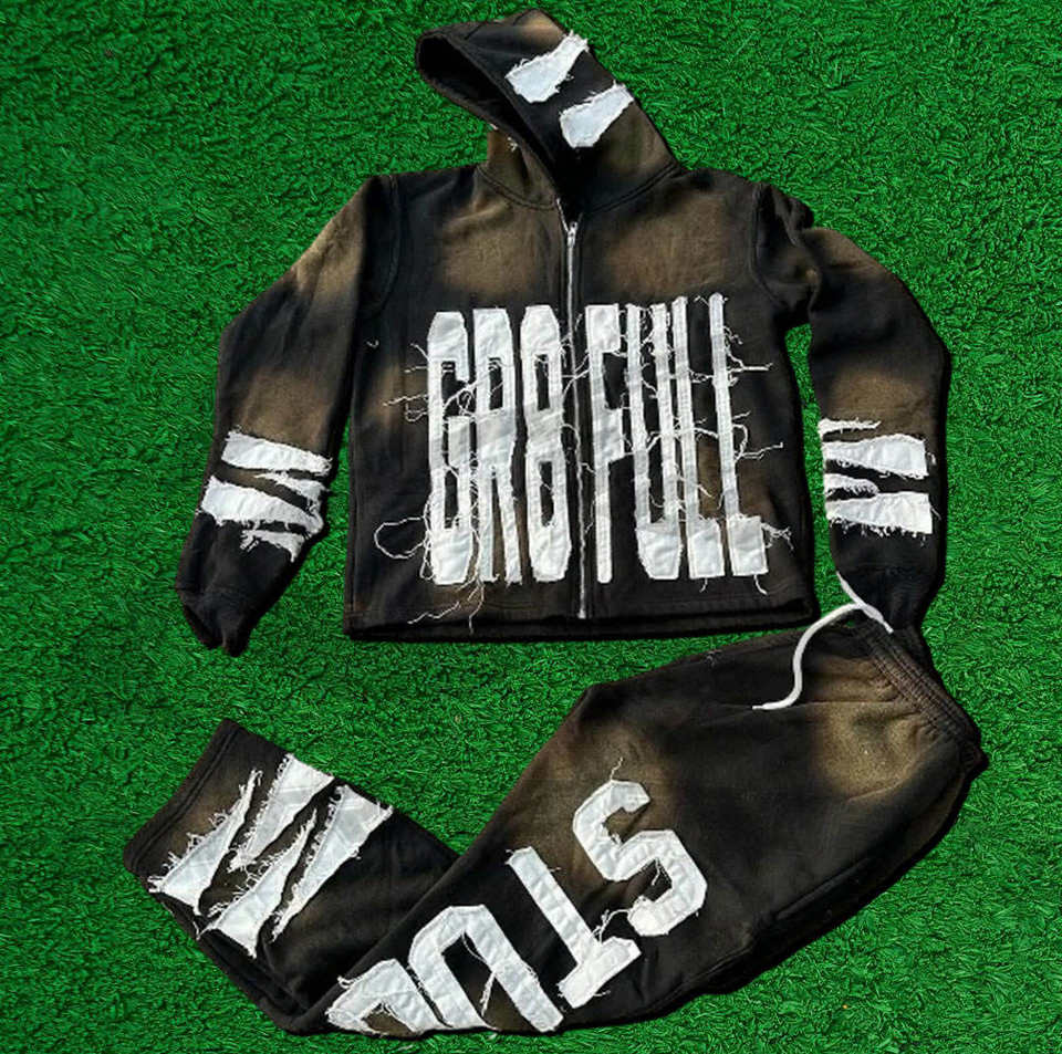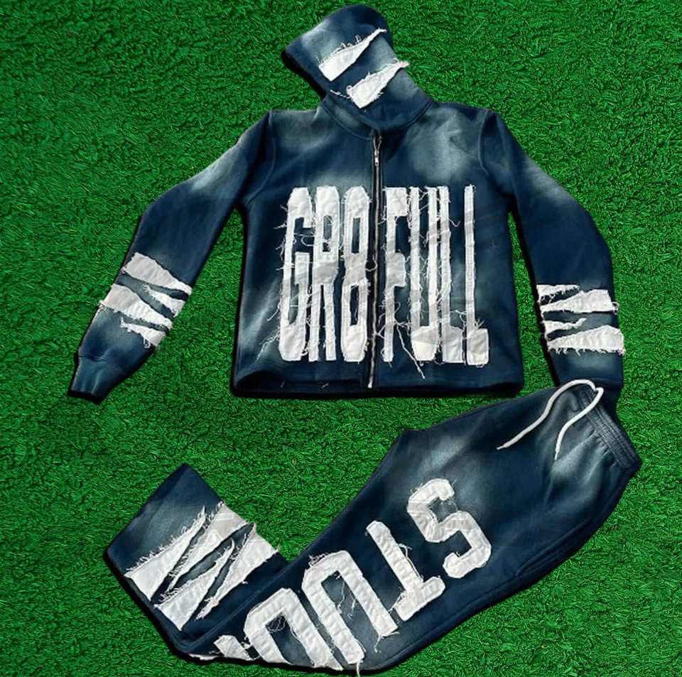 Wholesale Premium Quality 2026 Custom Distressed Applique Embroidery Cotton French Terry Acid Wash Streetwear Tracksuit For Men