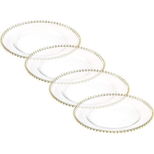 Wholesale Price Bulk 13'' Modern Rose Gold Rim Clear Glass Disposable Charger Plates Beaded Under Plastic Decorative Weddings
