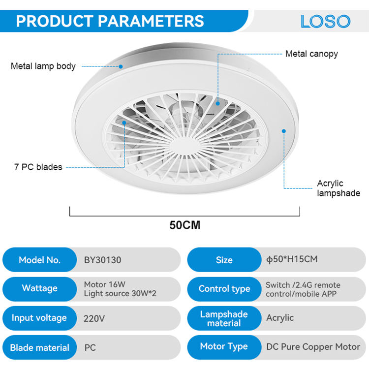 Wholesale Price Indoor Bedroom Kitchen Dc All Copper 16W Motor Dimmable 7 Blades Light LED Ceiling Fan Lamp
