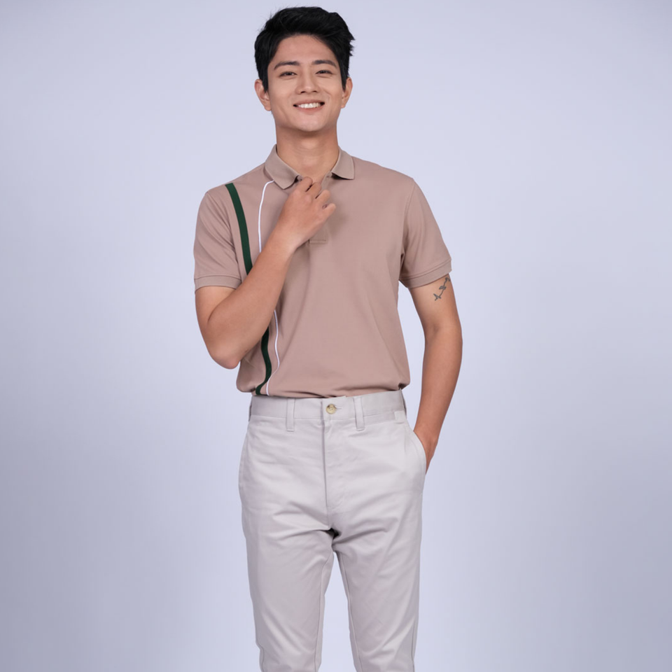 Polo Shirt with Contrast Corded Piping Lines Down Front