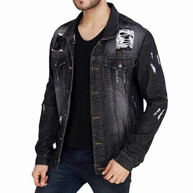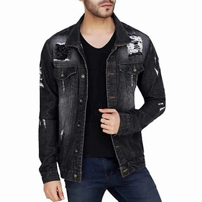 Wholesale Pure Cotton Denim Jacket for Men Custom Jean Jackets with Long Sleeves and Ripped Blue Finish Pre-Washed and Coated