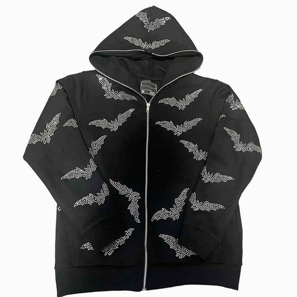 Wholesale Rate Newest Comfortable Product Men's Hoodies & Sweatshirts Black Full Zip up Face Custom Logo Rhinestone Hoodie