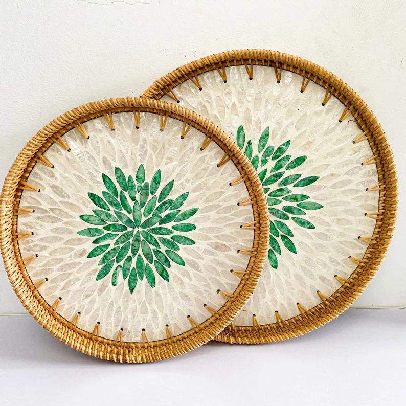 Wholesale Rattan Decorative Tray Eco-Friendly Serving Tray Plant Pattern Customized Design Mother Pearl Tray