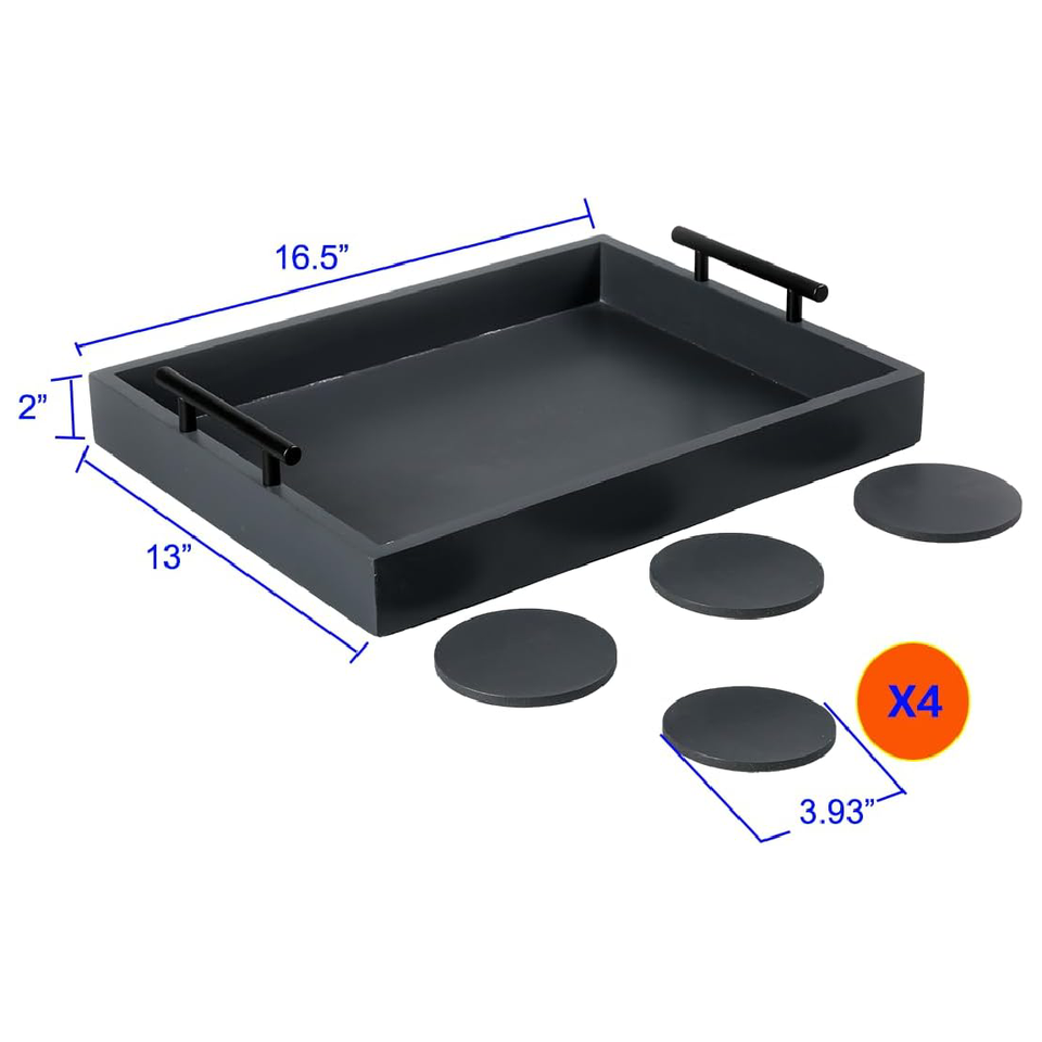 Wholesale Rectangle Black Color MDF Wood Tray with Metal Handles and 4 Coaster Set Coffee and Beverages Serving Wooden Platter