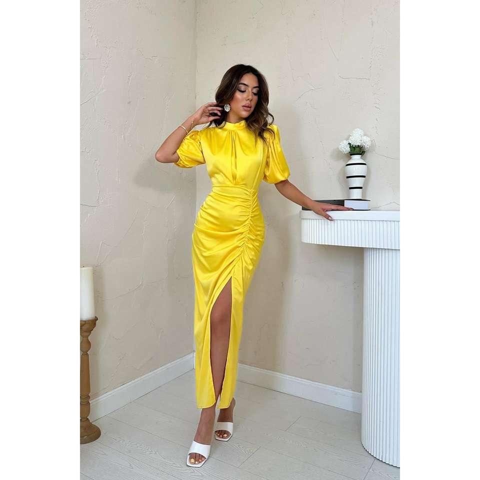 Wholesale Satin Yellow Ruched Evening Dress XS-XL Floor-Length Ball Gown A-Line Straight Empire Waist Simple Formal Party Style