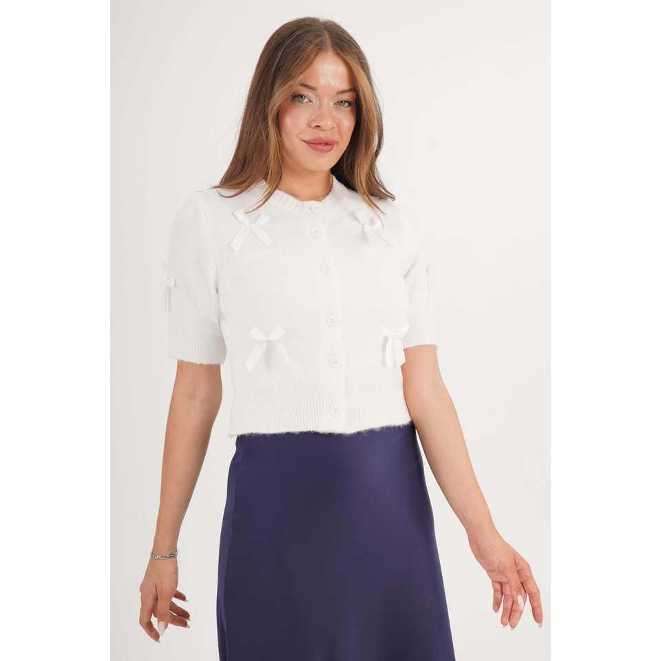 Wholesale Short Sleeve White Bow Ribbon Knitted Cardigan for Women